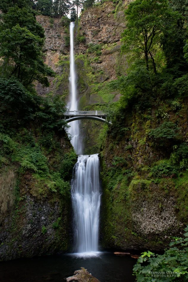 Here it is — the famous Multnomah Falls. This is the most renowned waterfall in the Columbia River Gorge. At a total height of approximately 620 feet, it is the tallest waterfall in Oregon. On any given day, you will see crowds of people photographing the falls. There are two main viewing areas to photograph the falls from. The lower viewing area (pic below) gives you the classic view of the falls and the Benson Bridge. There is a path that goes across the Benson Bridge and up the mountain to the top of the falls. We stayed at the lower viewing area.