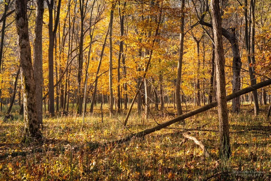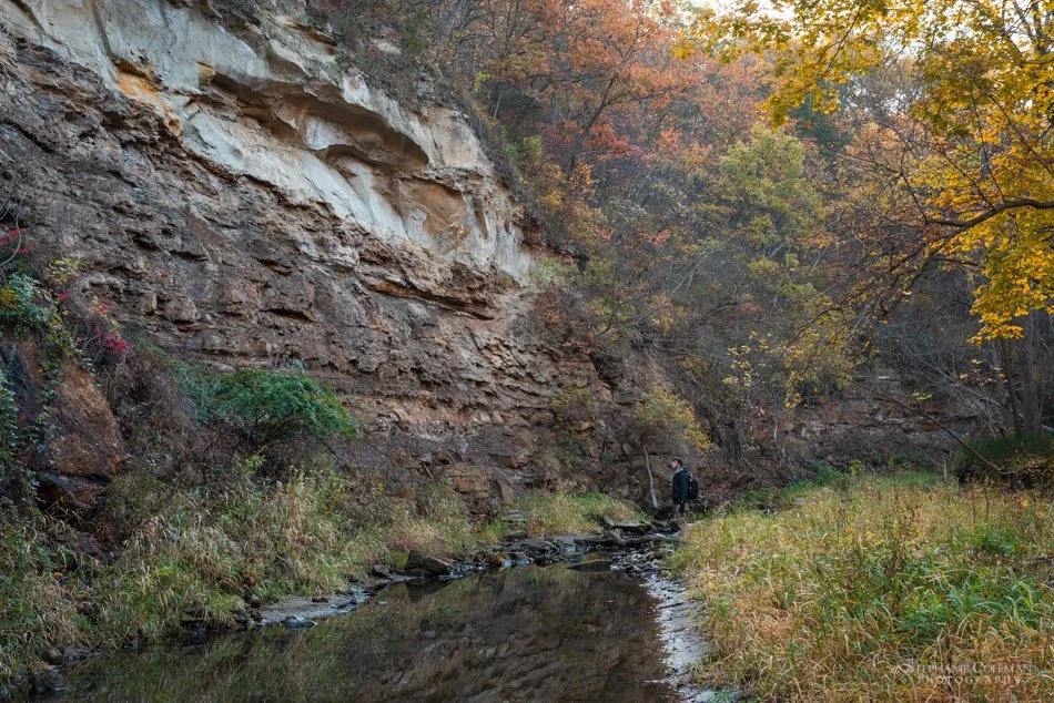 We visited Dolliver again for fall color this year toward the end of October. This time we hiked the Copperas Trail at the south end of the park. We started at the east trailhead (42.384460, -94.085223) and completed the full loop. The trail first crossed over a bridge and followed the main road a short ways before heading west up the hill into the forest. The trail wandered through the forest until about the halfway point where there was a nice clearing at the top of the hill. The trail then descended to the valley. Once down, the trail took us through a really nice section of forest before we got to a stream with sandstone bluffs named Copperas Beds. We walked along the stream a little ways to explore, before finishing the trail.