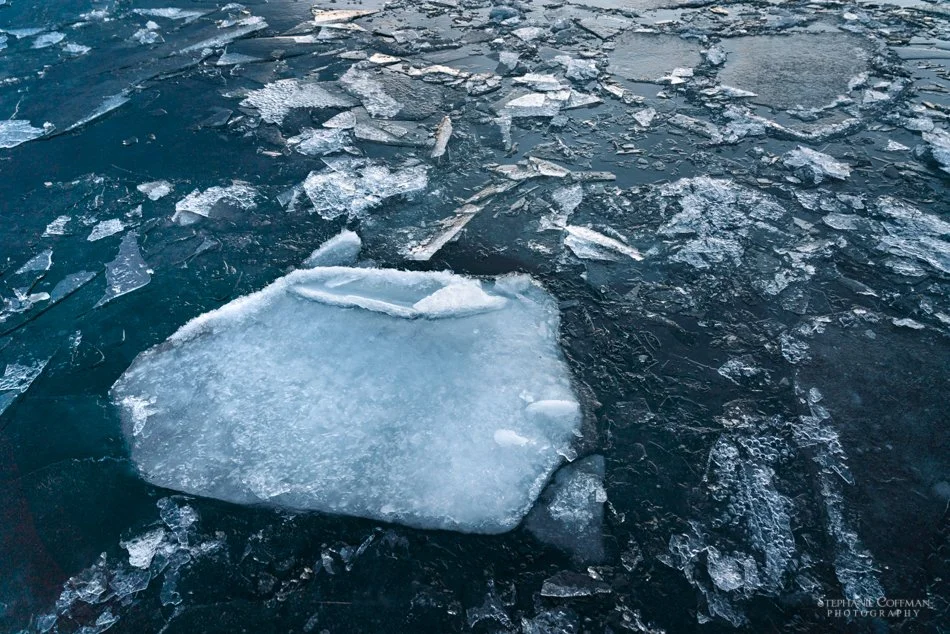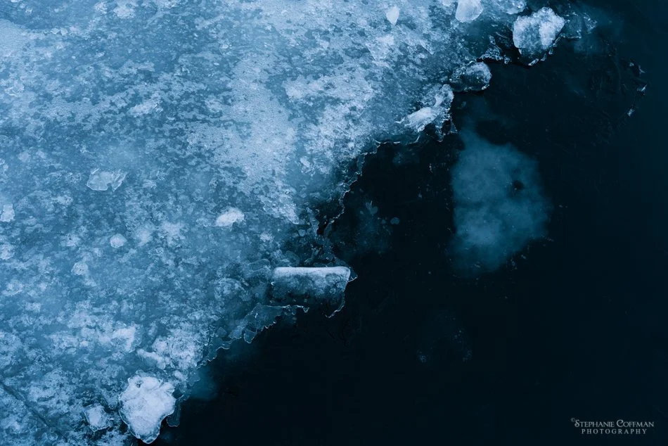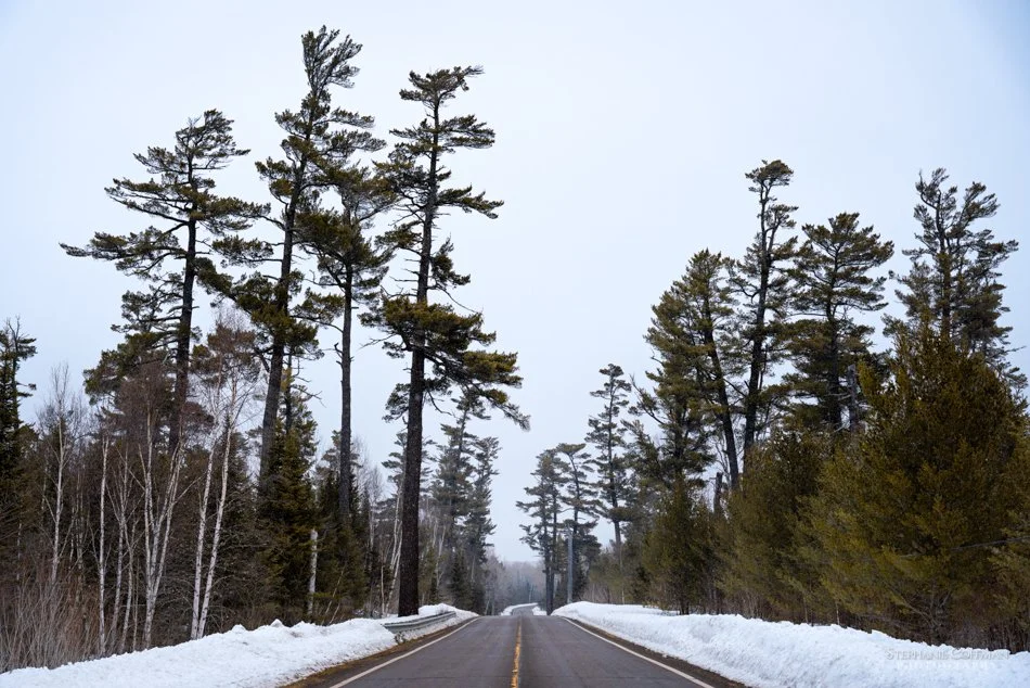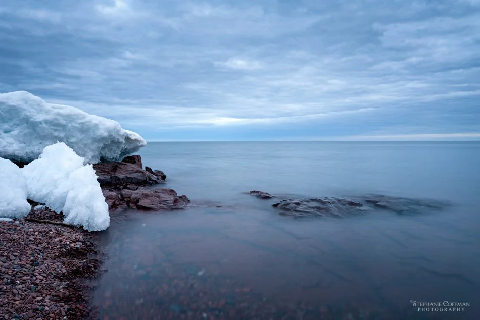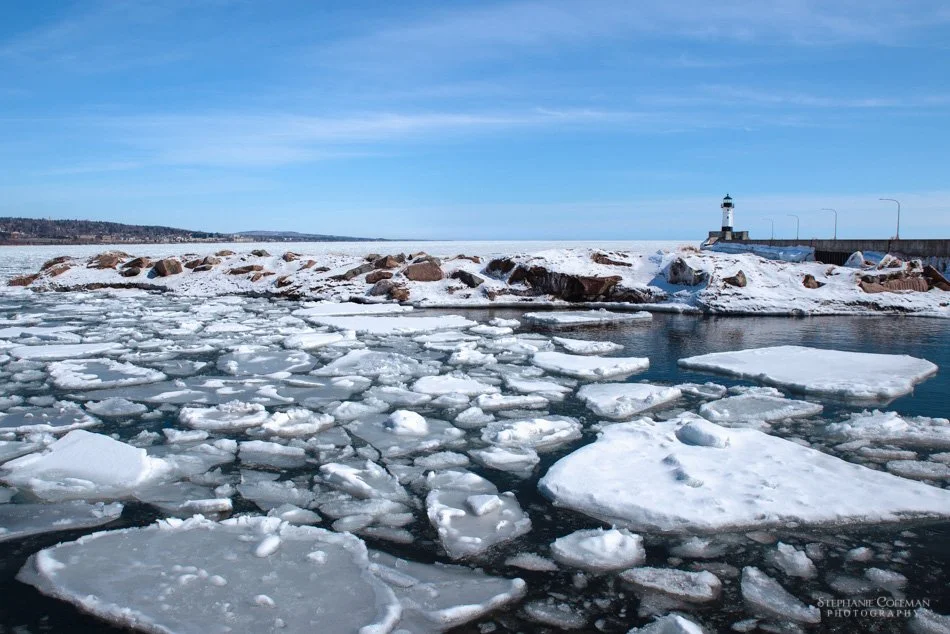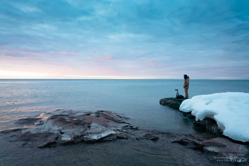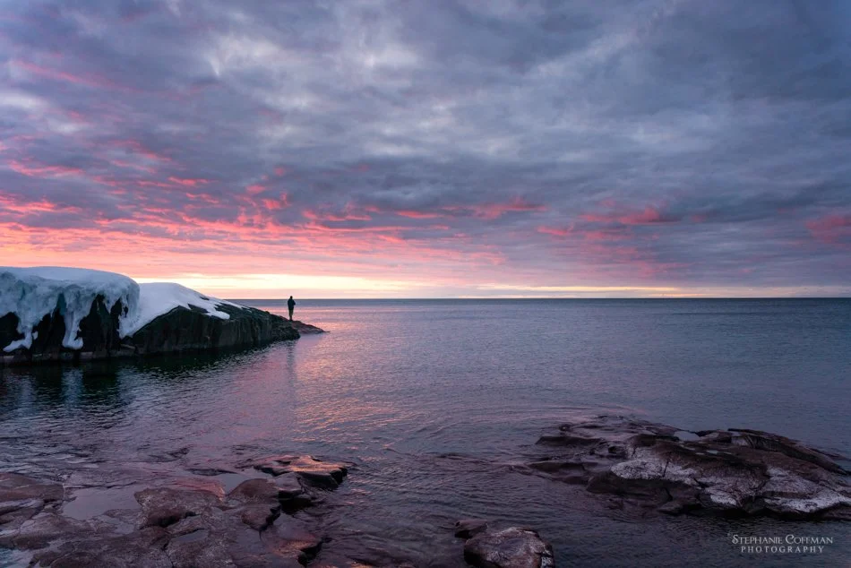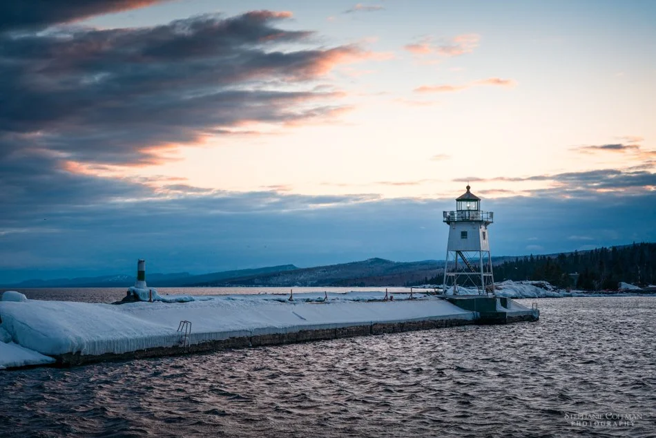 We started our second day with hopes for a sunrise, but got some moody clouds instead (not complaining!). I was excited to find some ice in the harbour and spent time photographing the ice patterns against the deep blues and teals of the water. Then we went for a drive up Gunflint Trail. We weren’t sure how many side roads we’d be able to access with all of the snow. It wasn’t many. Snow fell off and on as we explored new roads and thick forests. We spent the evening, again, at Artist’s Point. This time we walked out to the lighthouse along the breakwall, and it was windy!