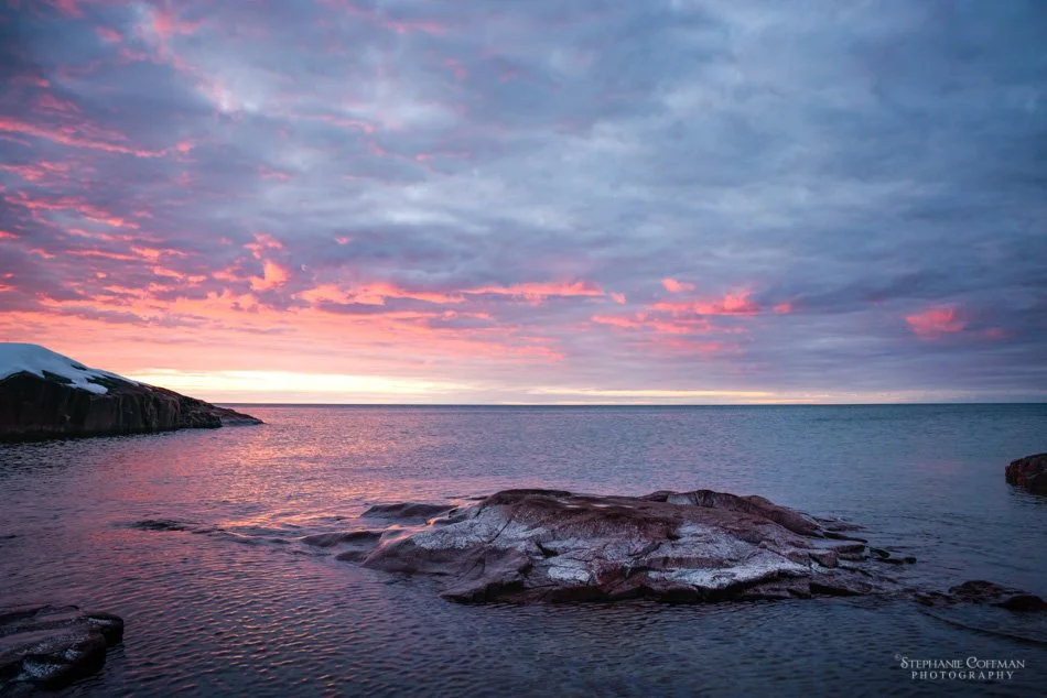 We drove up to Duluth in the morning and had lunch at the fantastic Great Harvest Bread Co. We stopped at Gooseberry State Park to check the waterfall status. The Upper Falls was still pretty frozen over. After arriving at our AirBNB, we headed out to Artist’s Point for sunset. We had some beautiful clouds that evening. If you want to see a 3 hour loop of what our view was like along with the sounds of Lake Superior, check out the video YouTube here.