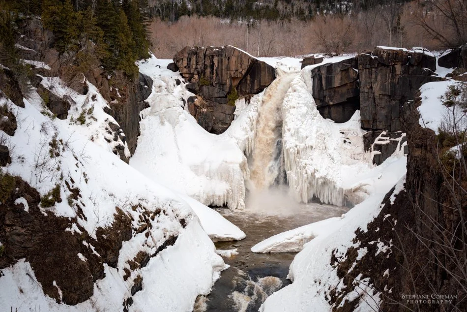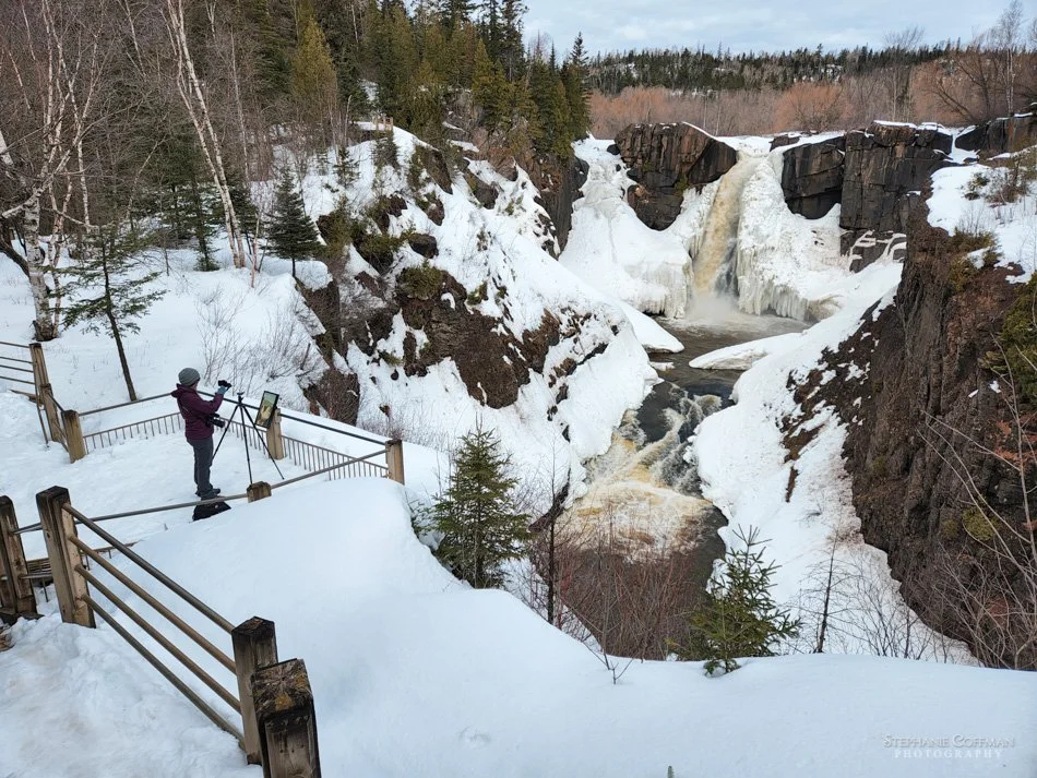 After Hollow Rock, we drove up to the Canadian border for a visit to High Falls in Grand Portage State Park. About half of the trail was paved and cleared. The other half of the trail was covered in a couple feet of packed snow with a thin layer of refreeze on top. That was fun. We made our way along the slippery trail to an overlook of High Falls on the Pigeon River. Canada is just on the other side of the Pigeon River.