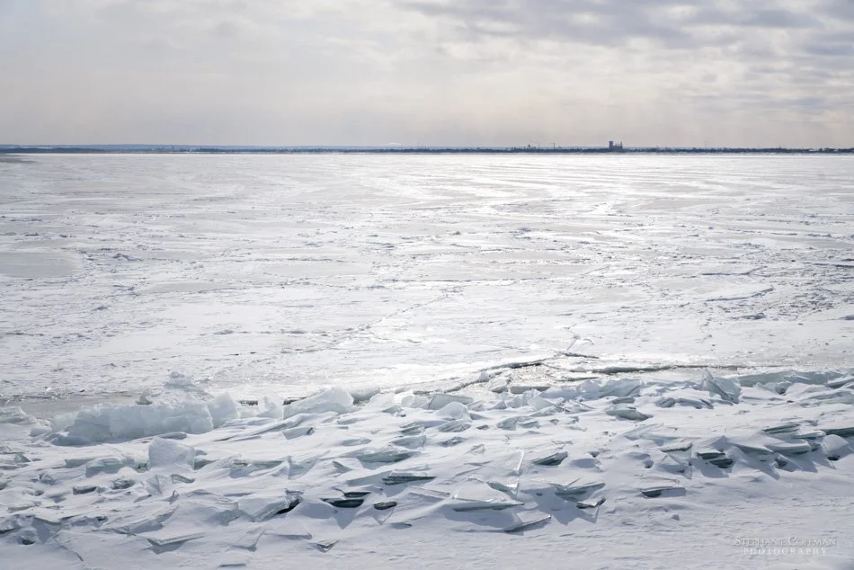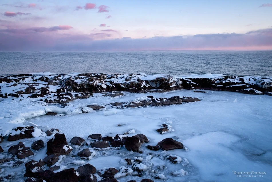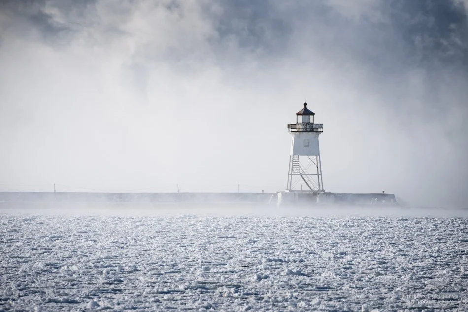 On our final morning, we woke up to a balmy -27°F at the rental cabin. It was COLD! It warmed up a few degrees as we drove closer to the lakeshore. We photographed sunrise from Stoney Point. Luckily, we didn’t have to walk too far from the car to take photos. After Stoney Point our final stop was at the Duluth North Pier Lighthouse to get photos of the lighthouse with the sea smoke.