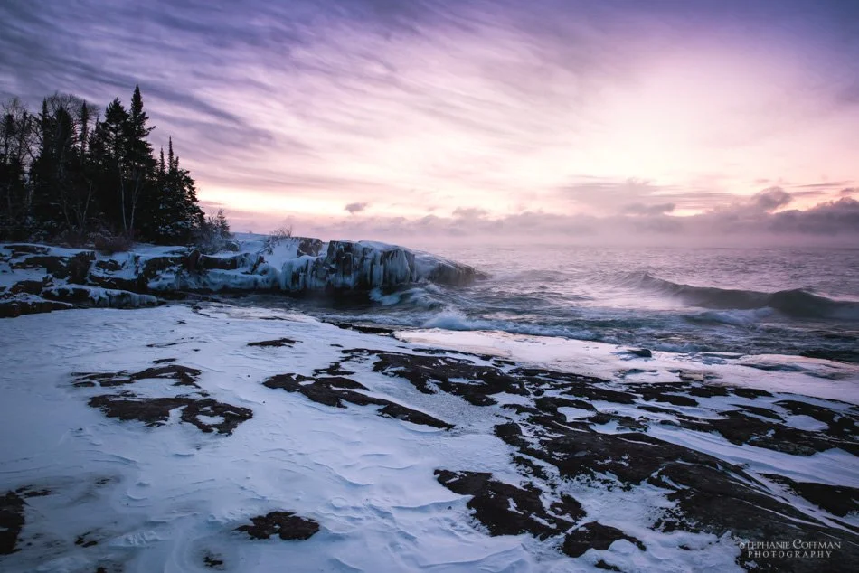 For our first full day, we started with sunrise in Grand Marais at Artist Point. Because of the extreme cold, we got to witness sea smoke! Sea smoke forms when extremely cold air (thanks to the polar vortex, in this case) moves over warmer water. The sea smoke added an element of drama to all of our early morning photos on this trip and made embracing the bone-chilling temperatures all the more worthwhile.