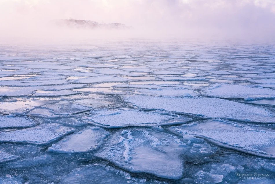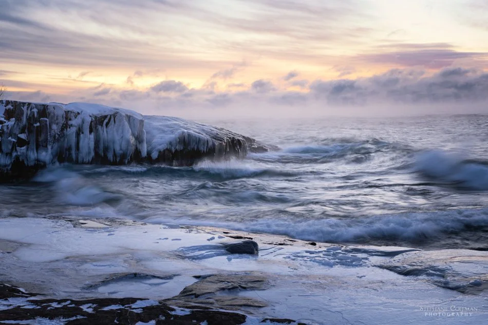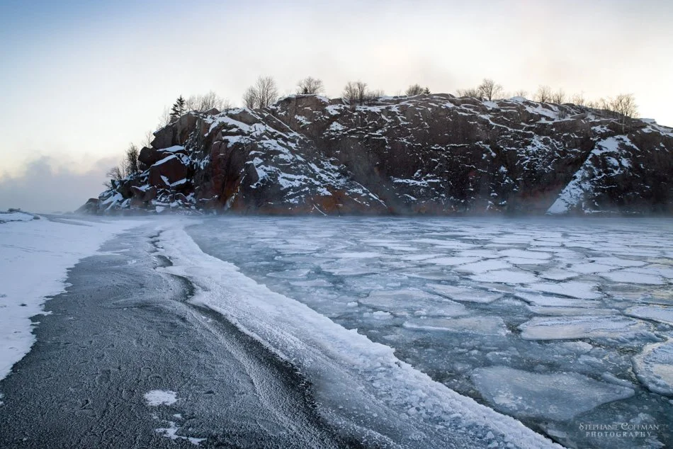 During our last couple of days we explored Split Rock Lighthouse, hiked up to Palisade Head from the lower parking lot (the road to the upper lot was closed), hiked along a little trail for a closer view of Shovel Point, and photographed along the Two Harbors breakwall. The sea smoke was mesmerizing to watch from Palisade Head! We also checked out the frozen Gooseberry Falls and a couple of short trails around Tettegouche State Park.