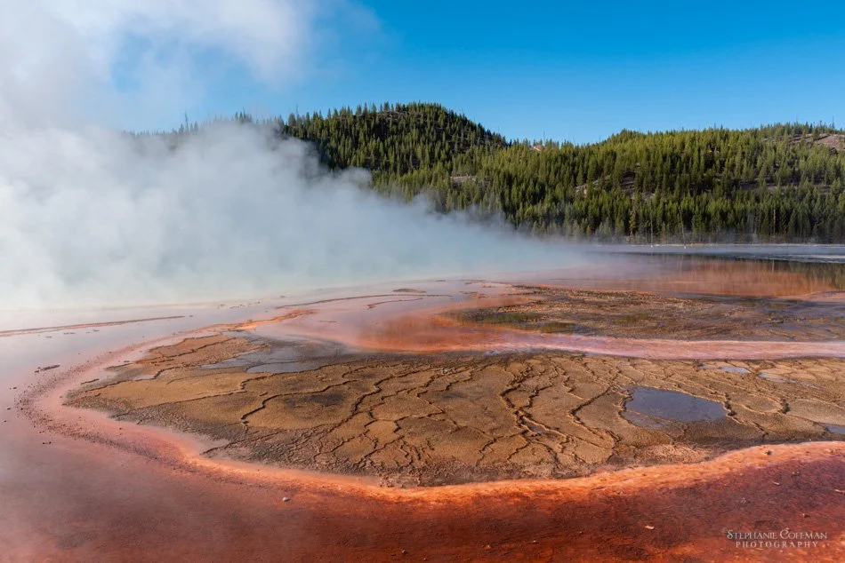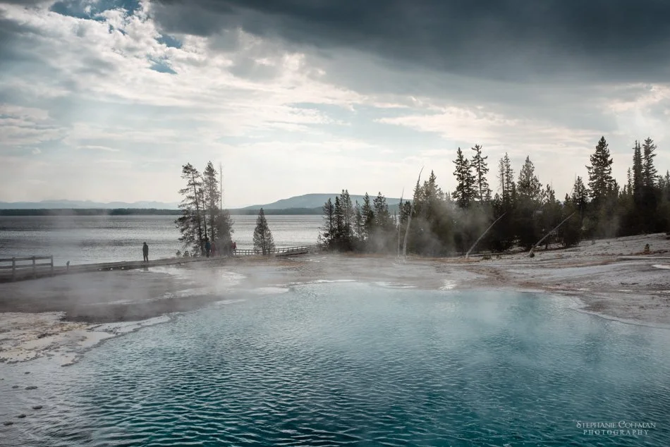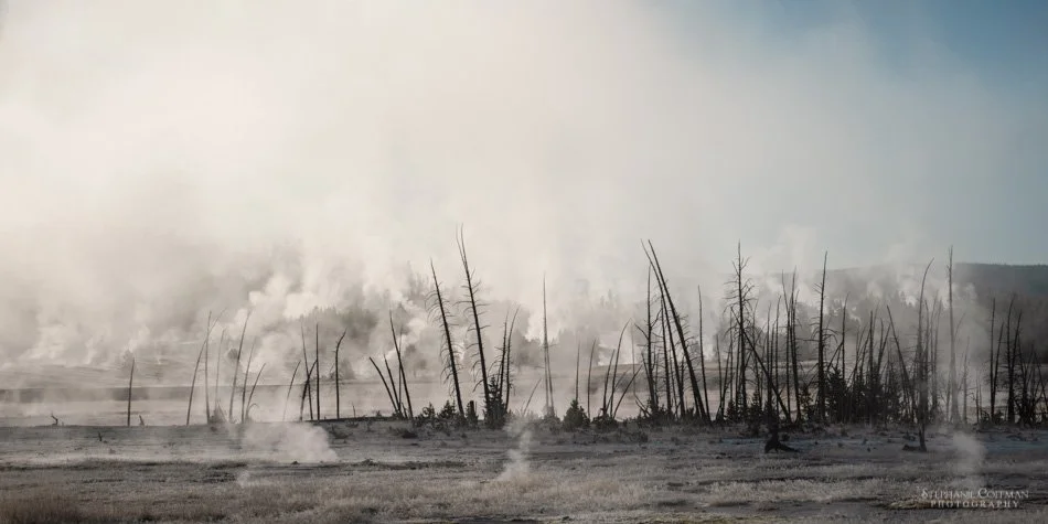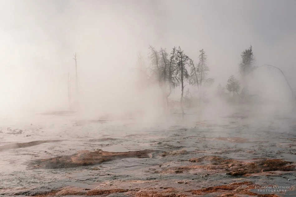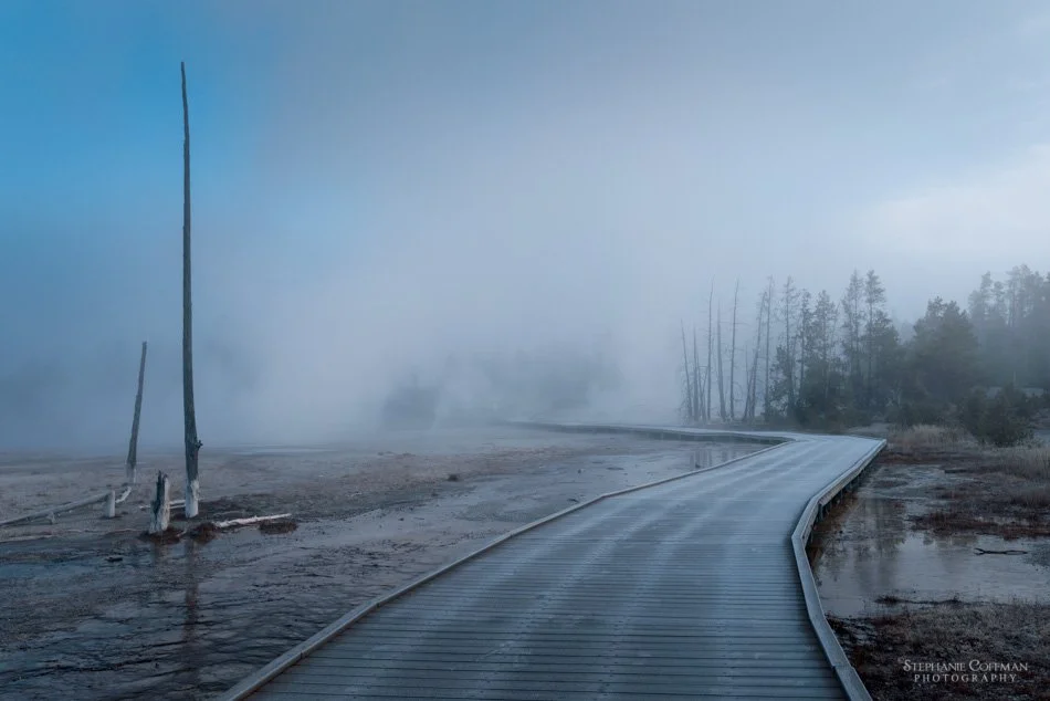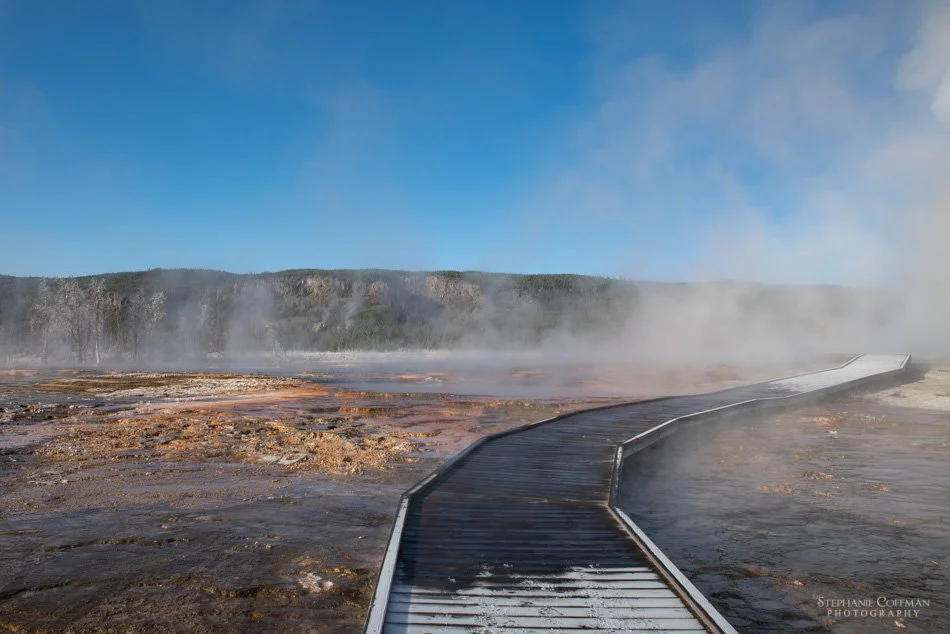 We had some fantastic lighting and steam during an early morning visit to Black Sand Basin. There is a section of the 0.5 mile (0.8 km) boardwalk that winds its way out to Emerald Pool. Photographing that winding boardwalk (pic below) was my favorite part of this stop. As with Biscuit Basin, there was too much steam early in the morning to get much of a glimpse of the colors in the thermal pools.