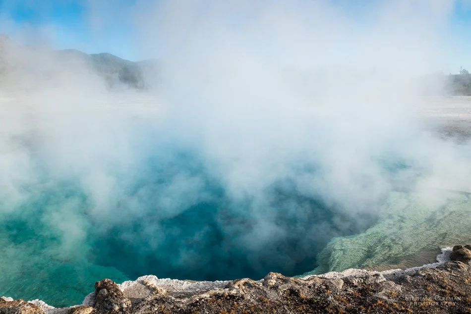 0.7 miles (1.13 km) of boardwalk guides you around Biscuit Basin. This particular thermal basin is not overly impressive but does have a couple of nice features. I was really hoping to see more of Sapphire Pool, but the steam was too thick early in the morning. If you continue the trail on the west side it takes you to Mystic Falls. We didn’t go there this time, but it’s definitely worth the walk.