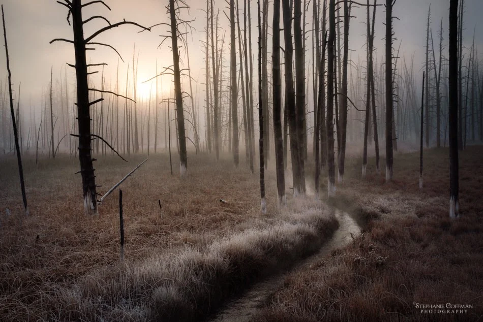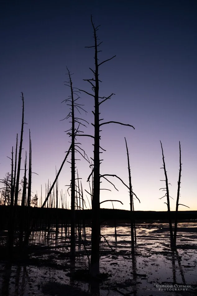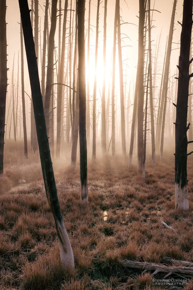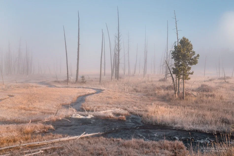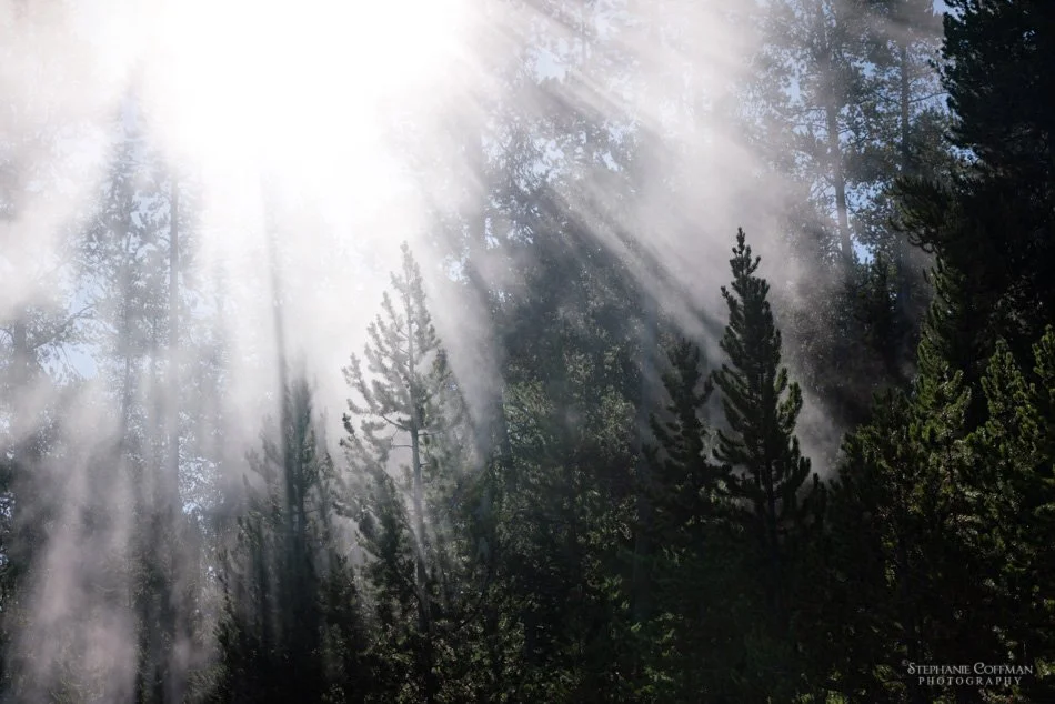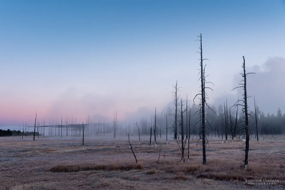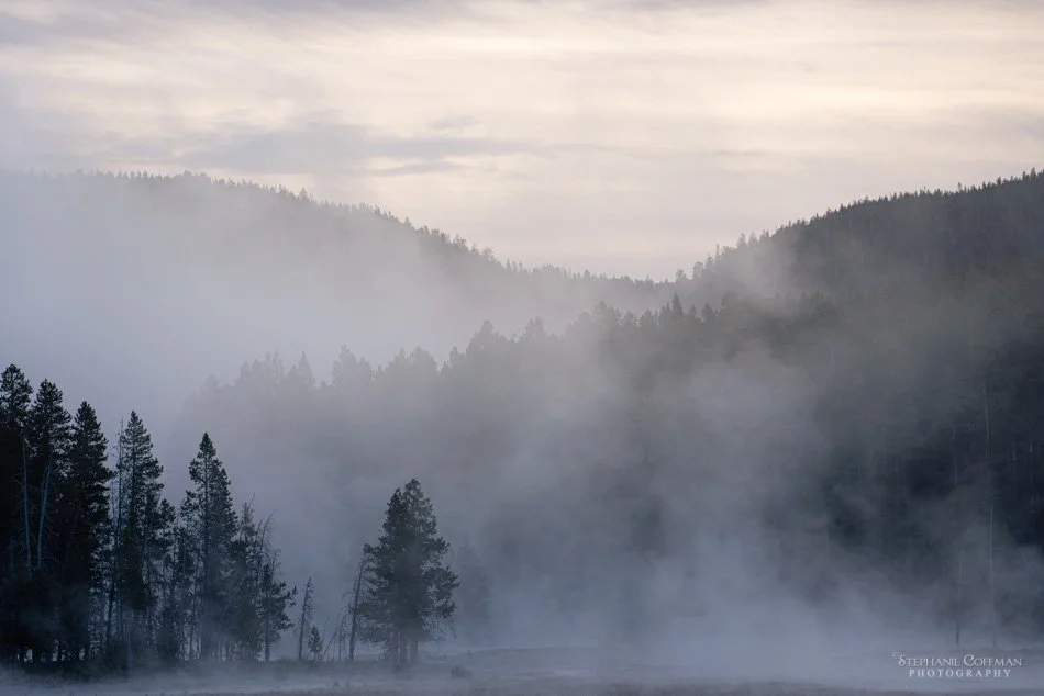 Every time I visit Yellowstone, there is something new to see. The photographic opportunities are plentiful - geysers, hot springs, wildlife, waterfalls, and dramatic landscapes. Our visit to Yellowstone this fall was bookended by exploring the Tetons (read more here). Upon our initial arrival in the park, we made a midday stop to see Old Faithful go off. It was quite busy, even for late September. By late morning parking lots for places like Midway Geyser Basin and Norris Geyser Basin were overflowing out onto the roadways. We focused our time in Yellowstone along the lower section of the Grand Loop Road, starting at sunrise and going until early afternoon. Afternoons were for relaxing and getting a coffee at a local coffee shop in West Yellowstone, MT where we stayed in a vacation rental. In the evenings, we went out to photograph sunset. We opted not to explore the northern section of the Grand Loop Road, because of our limited time and the section of road from Canyon Village to Tower-Roosevelt was closed. Standout photography moments on this trip included seeing my favorite geyser (Great Fountain Geyser) erupt twice, photographing one of my favorite moody forests, and seeing wolves in the wild for the first time.