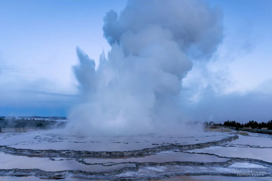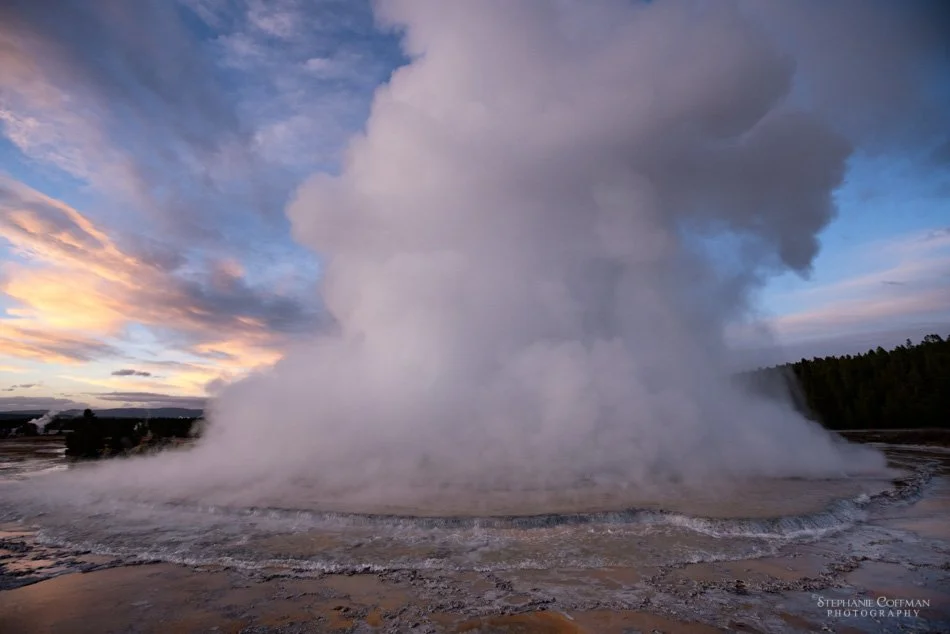 This area of Yellowstone is my favorite! Firehole Lake Drive is a loop that passes by multiple geysers, hot springs and open meadows. Great Fountain Geyser is the star of this area, in my opinion. It’s a beautiful, terraced geyser that erupts every 10-14 hours. About an hour before it erupts, water will start to flow out from the center and over the terraces. The boiling in the center intensifies before it begins erupting. The eruption itself can last 45-60 minutes and consists of a series of bursts. The average height of its eruptions is 100 ft. We were fortunate enough to witness a sunset eruption and a near sunrise eruption. The sunset eruption we photographed was the only evening we had clouds during our visit in Yellowstone. This gave us some nice color that lit up the sky.