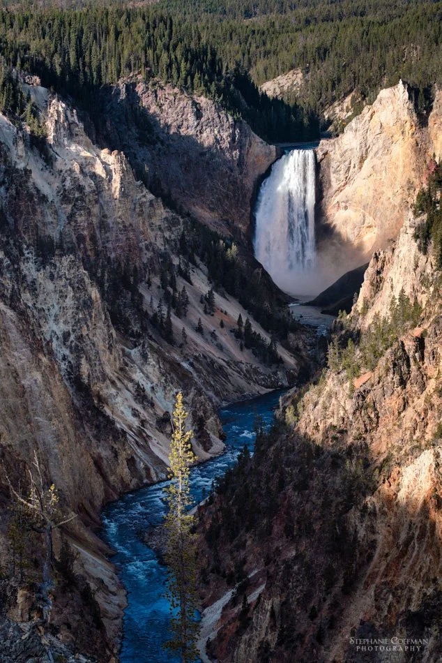 We visited three waterfalls on this trip: Moose Falls, Gibbon Falls, and Lower Yellowstone Falls. For more on waterfalls in Yellowstone, see this post. Moose Falls is one of my favorites in the park and our timing for visiting it worked out well as I was able to get a nice sunburst through the trees. Gibbon Falls has a large paved walking area along the road that offers several vantage points for photos. We photographed Lower Yellowstone Falls from Artist Point. It was one of the busier stops that we made and had to wait for space along the rock wall to take photos.