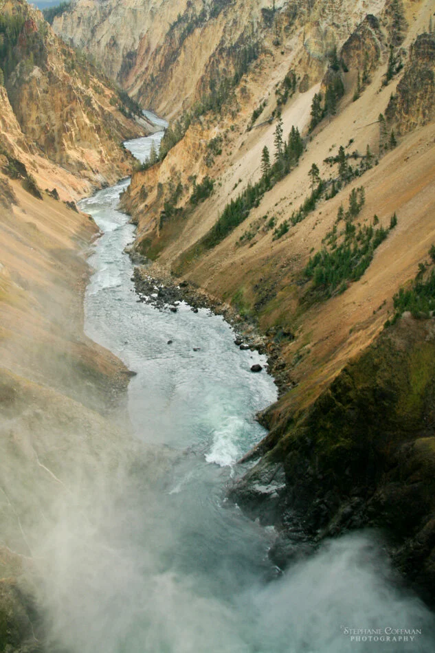 You really get a sense of the power of this river when you hike down to the top of the Lower Falls. From the parking area, the hike down to the Brink of the Lower Falls is short, but it is also steep. It puts you right on the edge of the top of the waterfall (with safety railing of course) where you can watch the water fall over the edge and down into the canyon below.